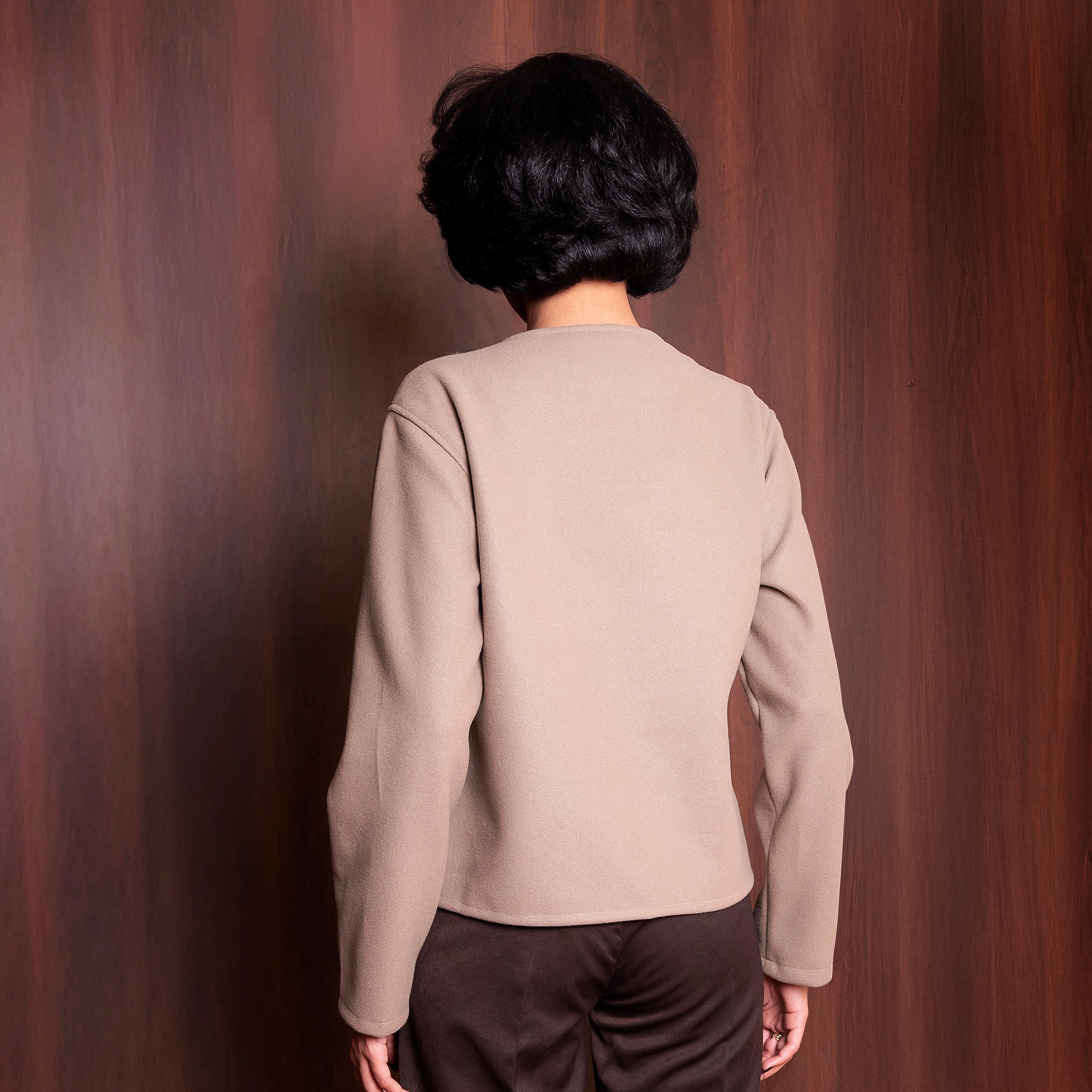 Short coat made of woolen blend fabric. Long sleeves. Double-breasted button fastening at the front. The material has medium thickness, providing comfort and structure without feeling heavy.